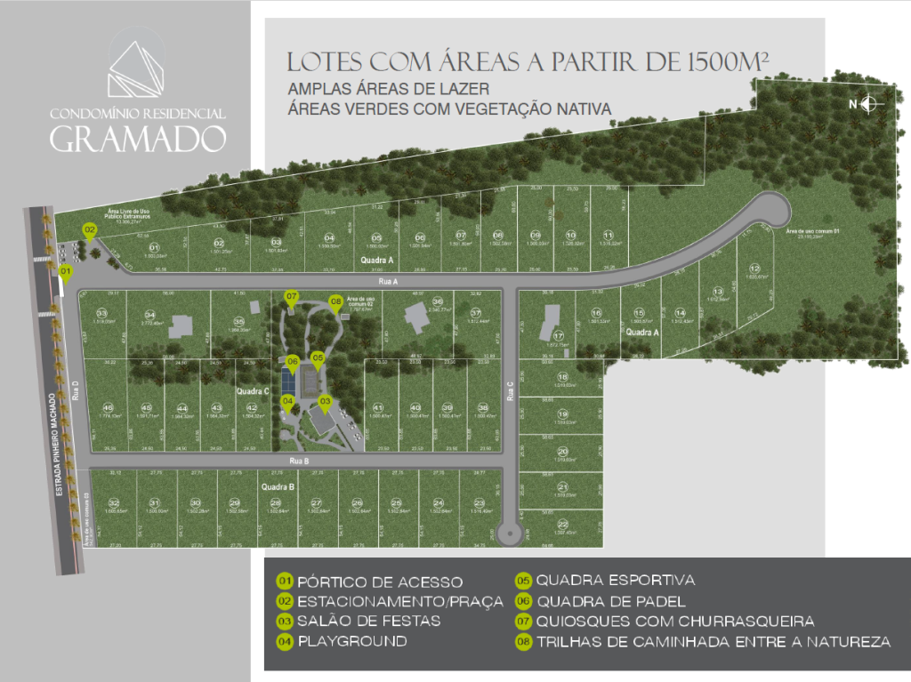 Descubra um lugar onde a natureza abraça o seu dia a dia. No Residencial Gramado, você encontra lotes exclusivos a partir de 1.500m², perfeitos para construir com liberdade, privacidade e alto padrão.