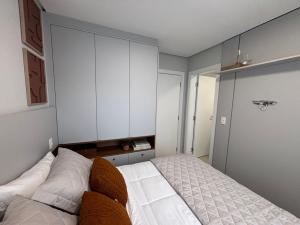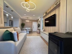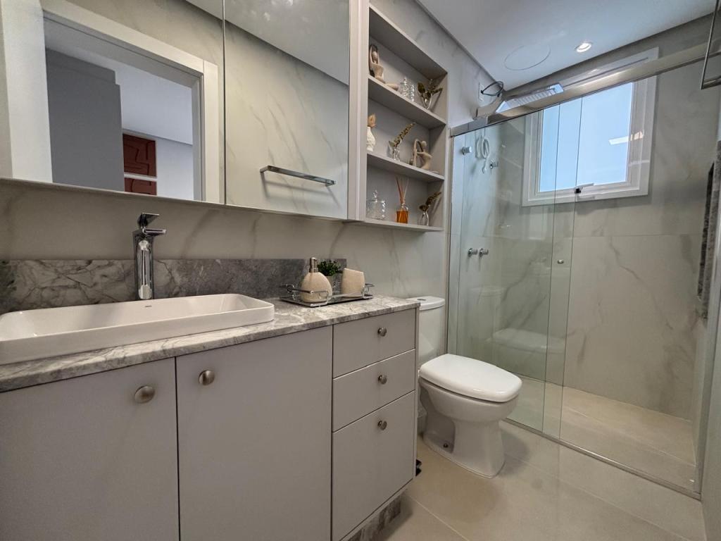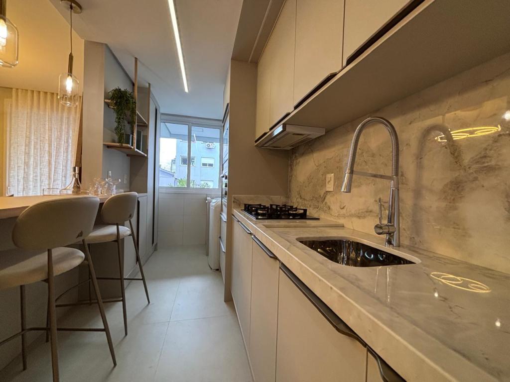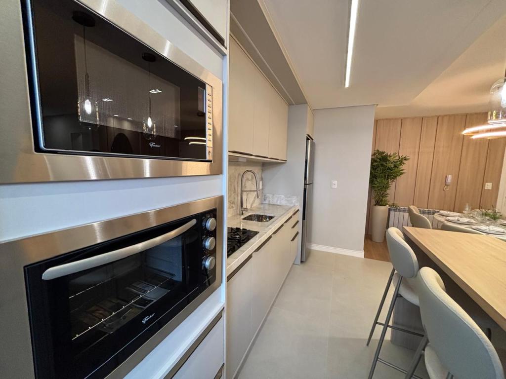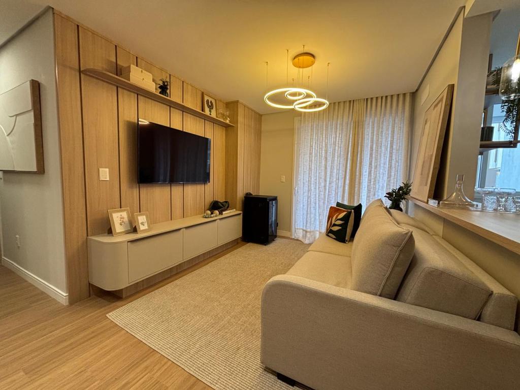 São 2 suítes, cozinha planejada, área de serviço completa, lavabo, uma vaga de garagem, lareira, churrasqueira/bifeteira, climatização completa na sala e dormitórios, além de TV já instalada.